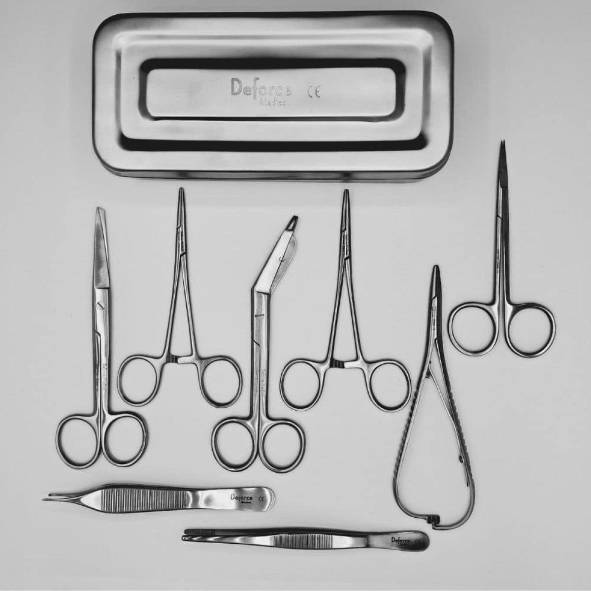 De instrumentenset voor hechting bevat diverse gereedschappen die helpen bij het sluiten van wonden, het hechten van weefsels en het bevorderen van een vlotte genezing.