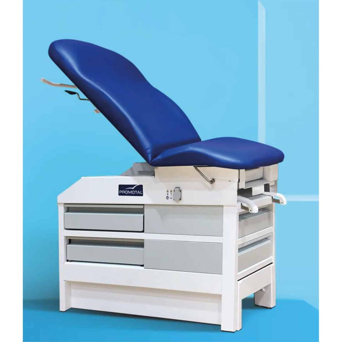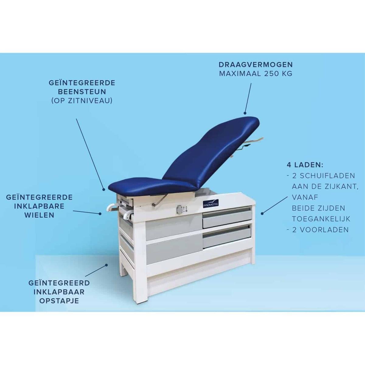 Geïntegreerde uitschuifbare beensteunverlenging op dezelfde hoogte als de stoel (afhankelijk van model). Optimale comfortstoel. Mogelijke opties: 2 geïntegreerde stopcontacten aan de zijkanten & verstelbare beensteun. Beschikbare accessoires: Fixatieklem, lamphouder, Armsteun + hoes, ladenbakken, opbergruimte, beensteunen, infuusstaander, ... De tafel is beschikbaar in 19 Promotal kleuren. Zie foto's. De Kompact onderzoekstafel is ook verkrijgbaar met block n' roll wielsysteem zie ref.150021