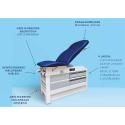 Voer uw onderzoeken gemakkelijker uit door een comfortabele zithouding met deze onderzoekstafel, 4 Lades om alles wat je nodig hebt binnen handbereik te houden, 2 doorschuifbare zijladen, van beide kanten toegankelijk (waardoor je de tafel in het midden van de examenruimte kunt plaatsen), 2 Lades vooraan, geïntegreerde intrekbare stijgbeugels & bekkenkanteling (7 graden)