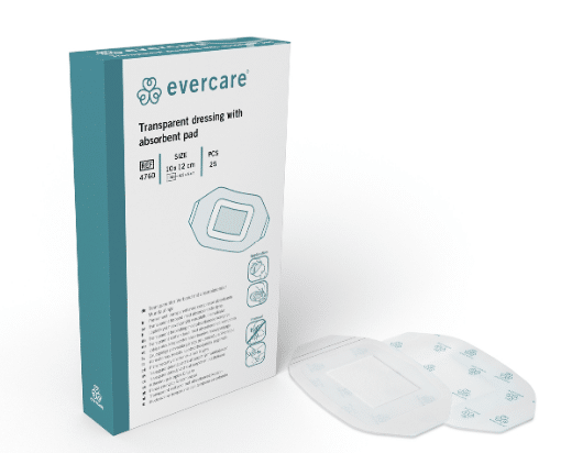 De transparante eilandpleister van Evercare is een waterdichte pleister met een ademende polyurethaan filmlaag en een absorberend kompres met niet-verklevende